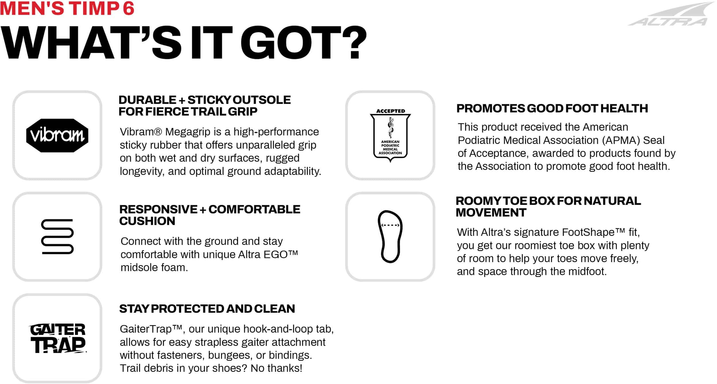 When you've got confidence and durability underfoot, no terrain is off-limits. So hit the trail hard in a shoe with an outsole redesigned to be even stickier and a soft rolled mesh upper. This redesigned Vibram® Megagrip outsole is made to give you traction on any terrain while a premium upper combines with precisely updated fit construction to help deliver an elevated step-in feel, durability, and comfort. We added overlays for protection but made sure you've still got a comfortable flex for the ups and downs. And our Altra EGO MAX midsole foam delivers light and luxurious performance with a little bounce. Space out with a roomy toe box, with plenty of room for your toes to move freely and a secure midfoot. Grip? Durability? And comfort? Looks like the Timp 6 has all the makings of your new favorite trail running shoe.