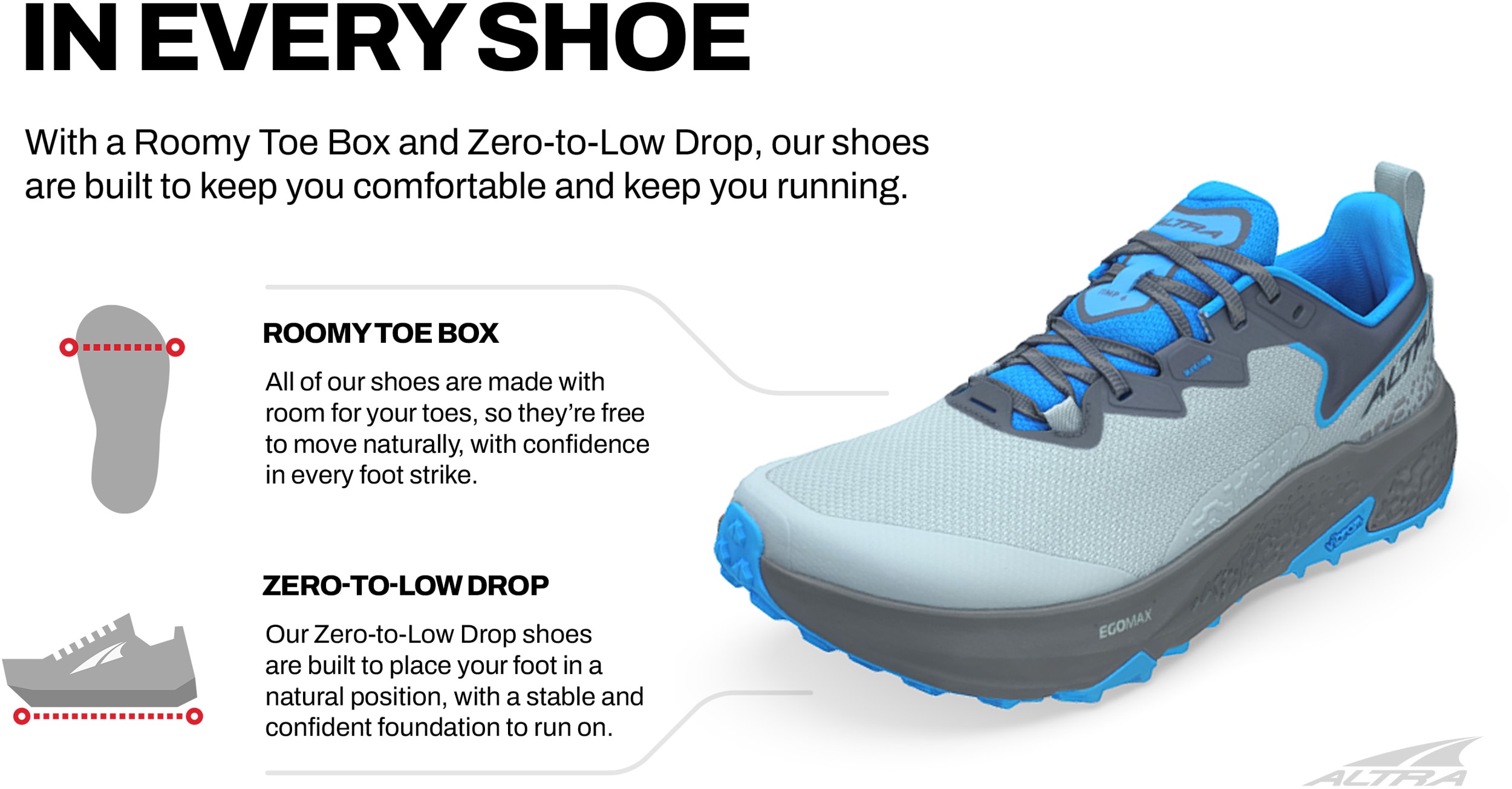 Roomy toe box for natural movement - With Altras signature FootShape fit, you get our roomiest toe box with plenty of room to help your toes move freely, and space through the midfoot.