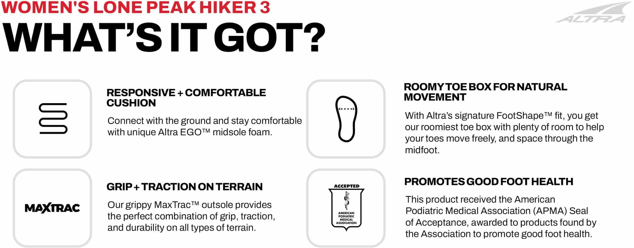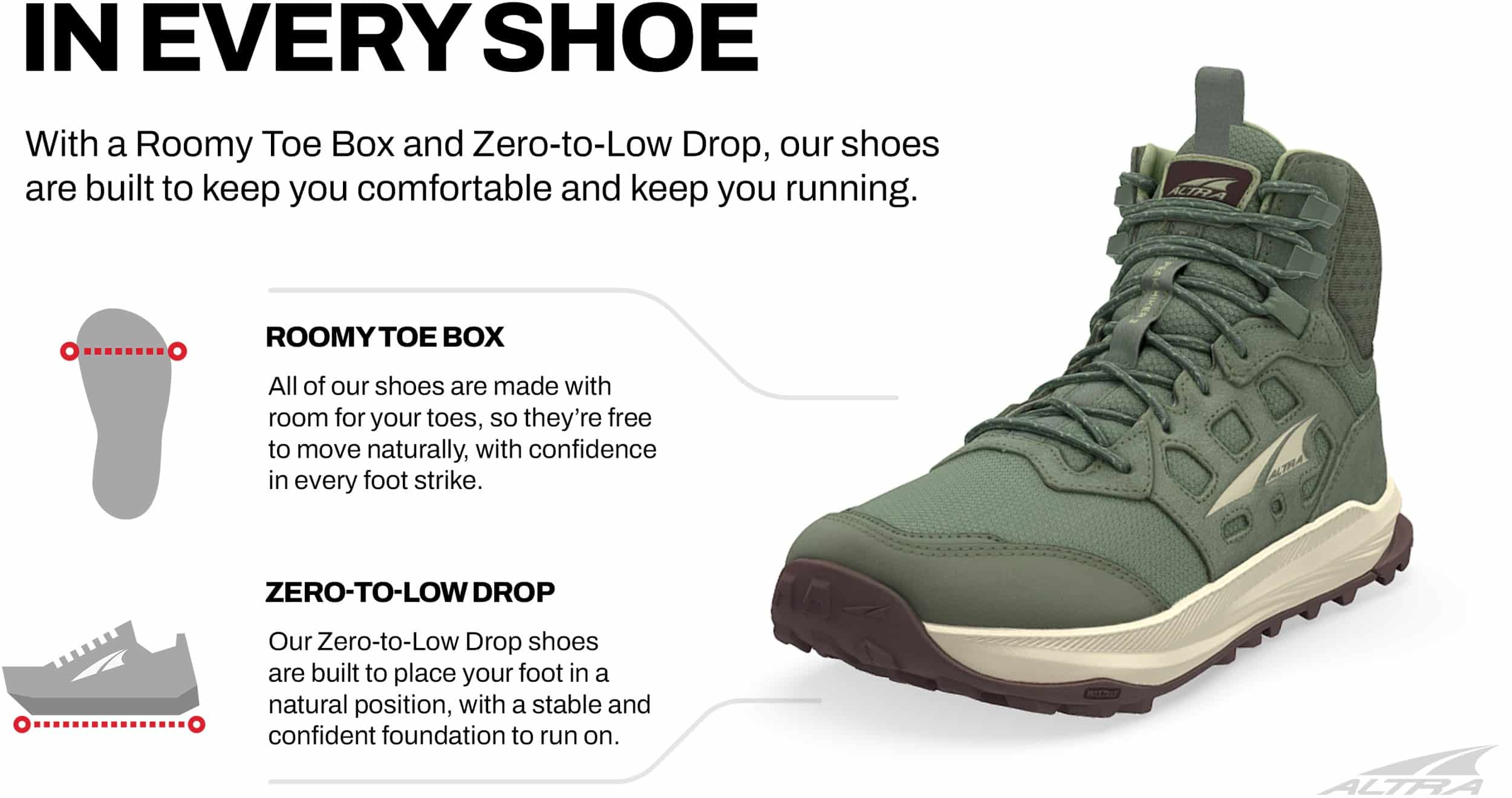 Roomy toe box for natural movement - With Altras signature FootShape fit, you get our roomiest toe box with plenty of room to help your toes move freely, and space through the midfoot.