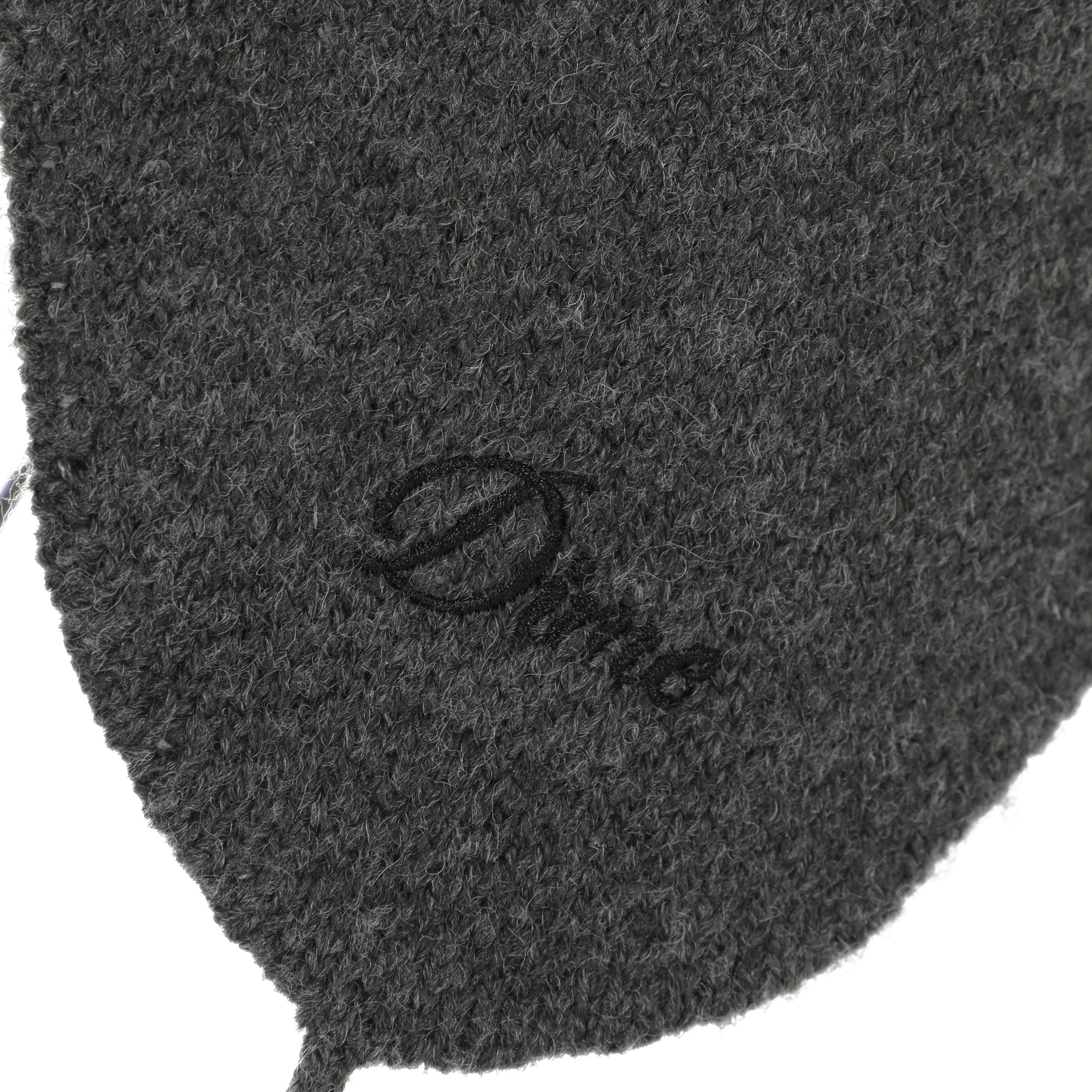 Cursive embroidery on left earflap