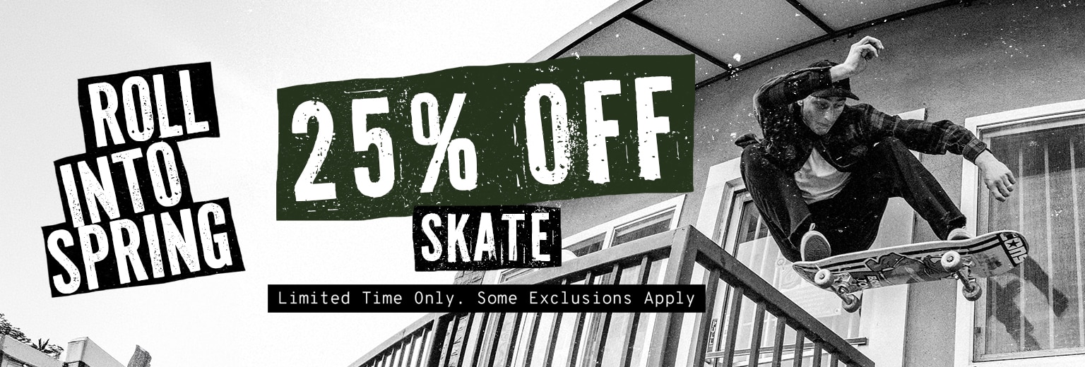 Roll into spring with 25% of skate. Shop your favorite deck, truck, and wheel brands at discount pricing for a limited time