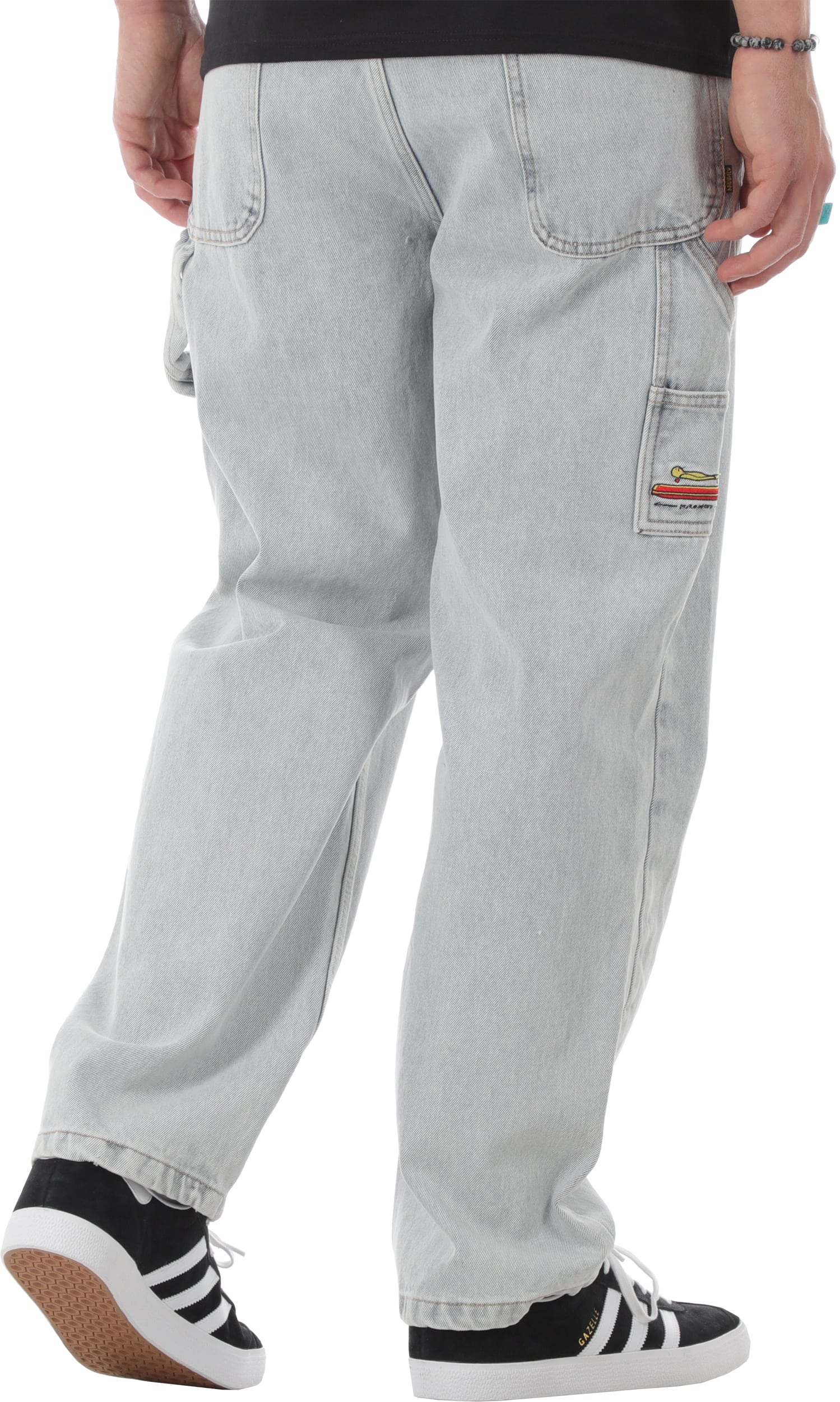 Roll in style with the Krooked Koffin Carpenter Jeans. These pants are built tough with cotton denim and a relaxed fit that's perfect for skating. They've got all the right pockets, plus you've got a hammer loop, and the Krooked embroidery on the leg utility pocket is the perfect final touch of steez.