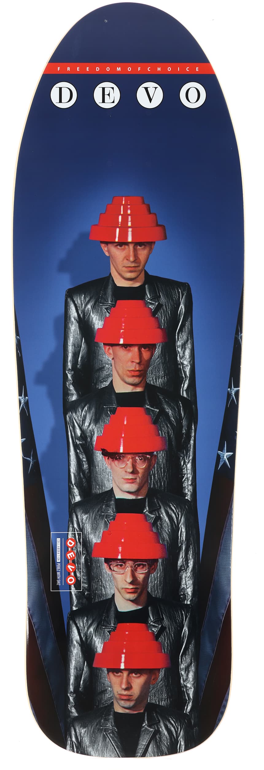 This Freedom Of Choice board is part of a 5 board series of DEVOs 1st 5 Album Boards! in collaboration with Perez With Saiz. This tribute board references DEVOs 3rd album, Freedom Of Choice, Released in 1980. The top graphic features the record label of songs and credits.