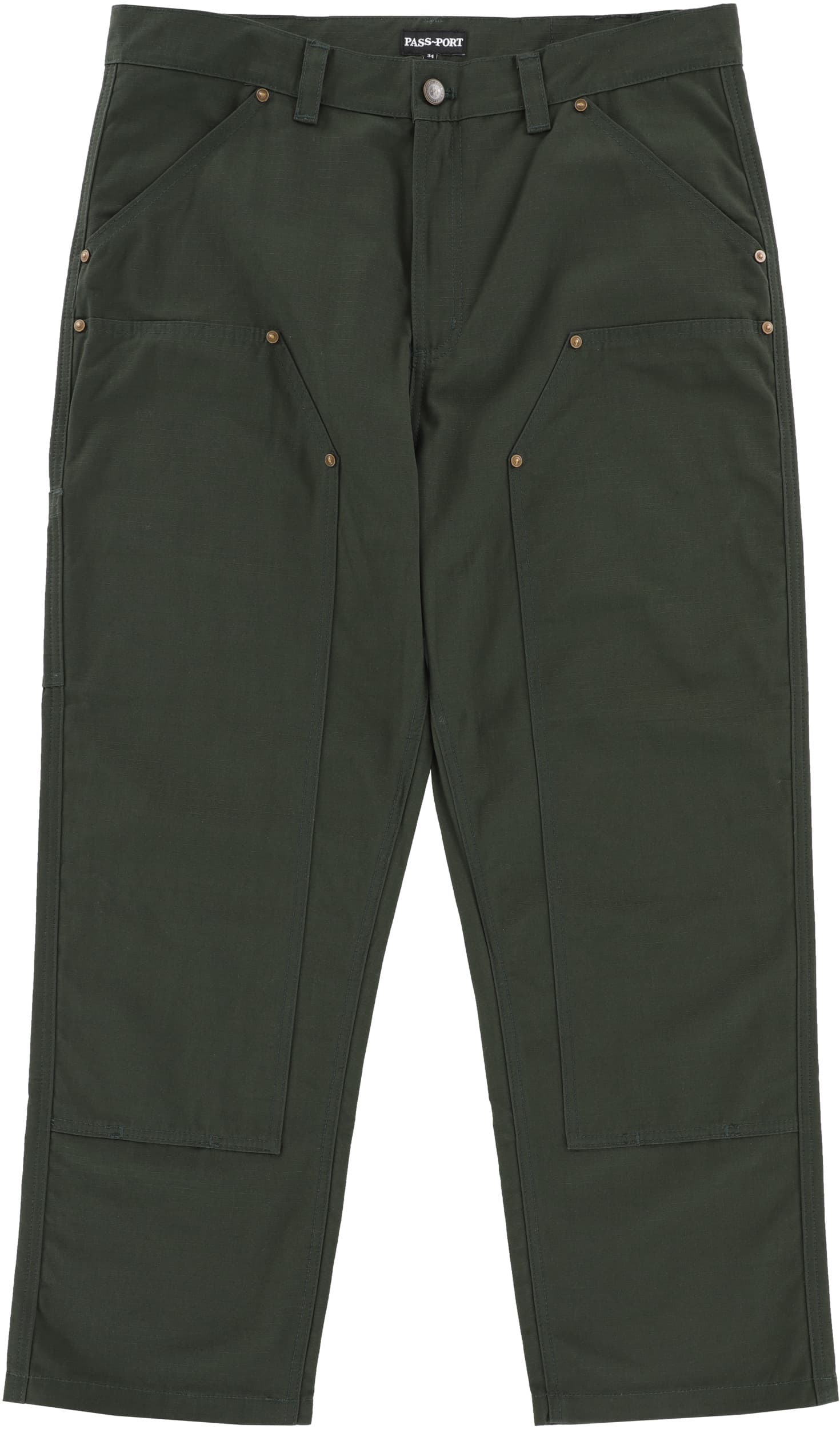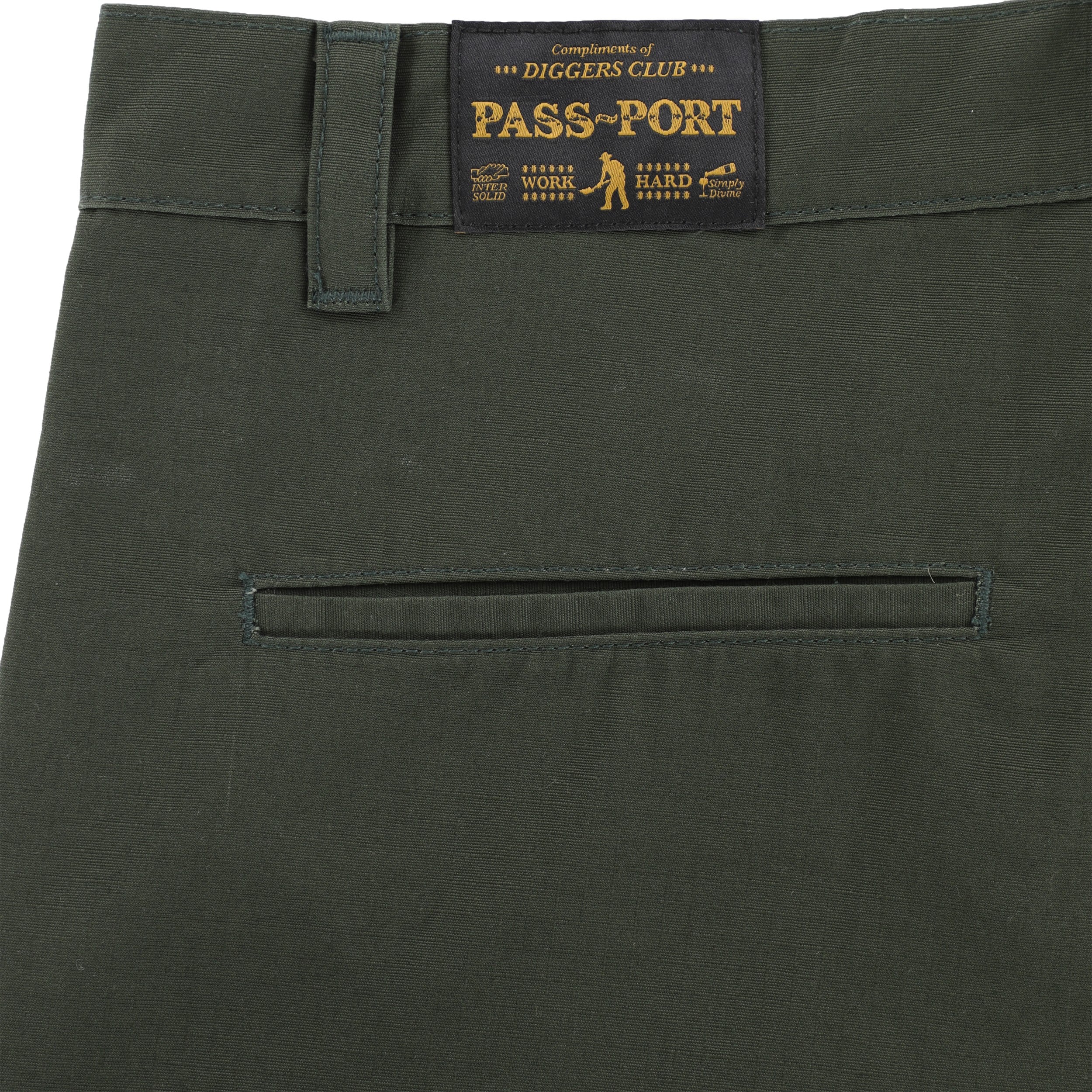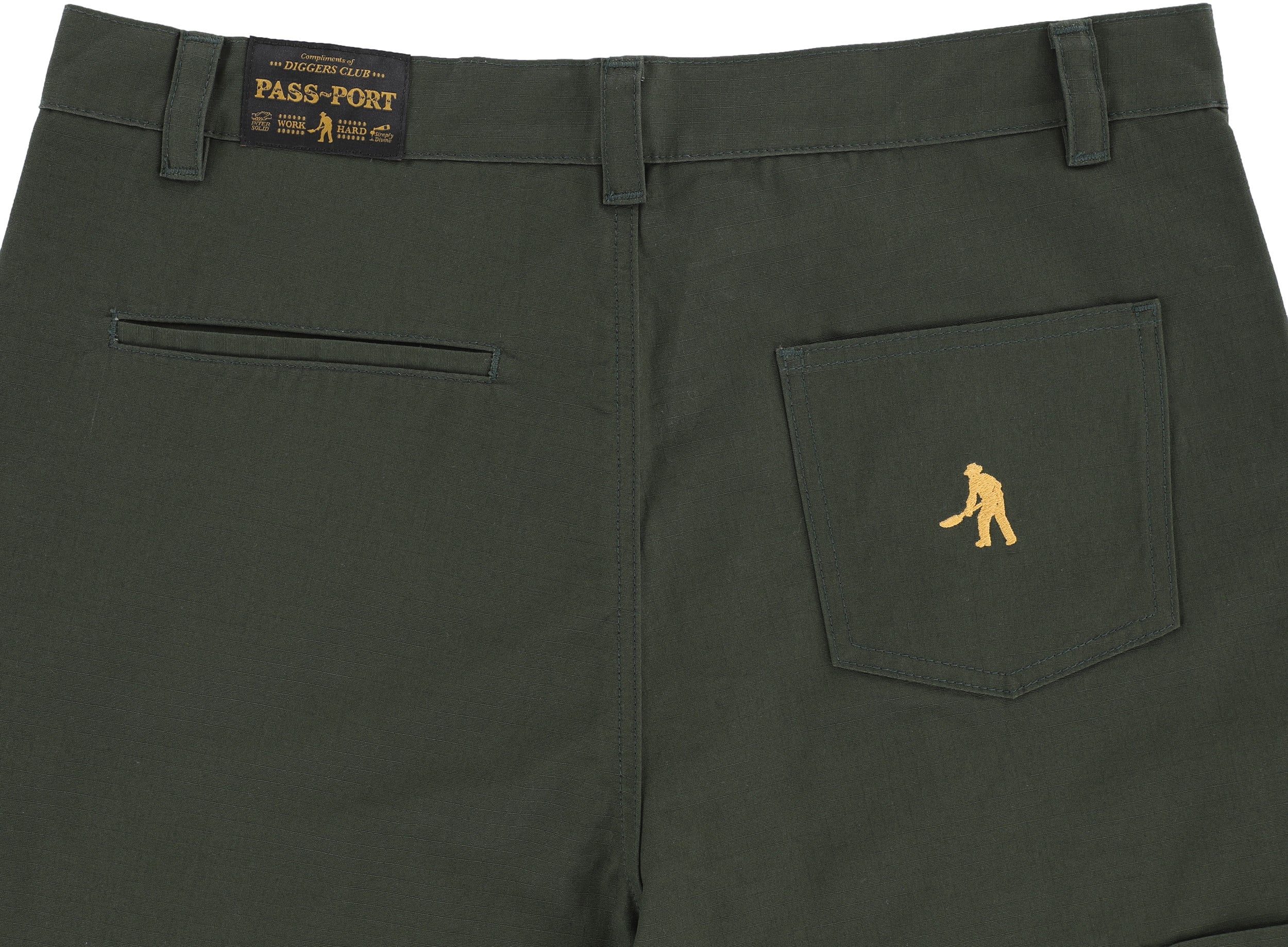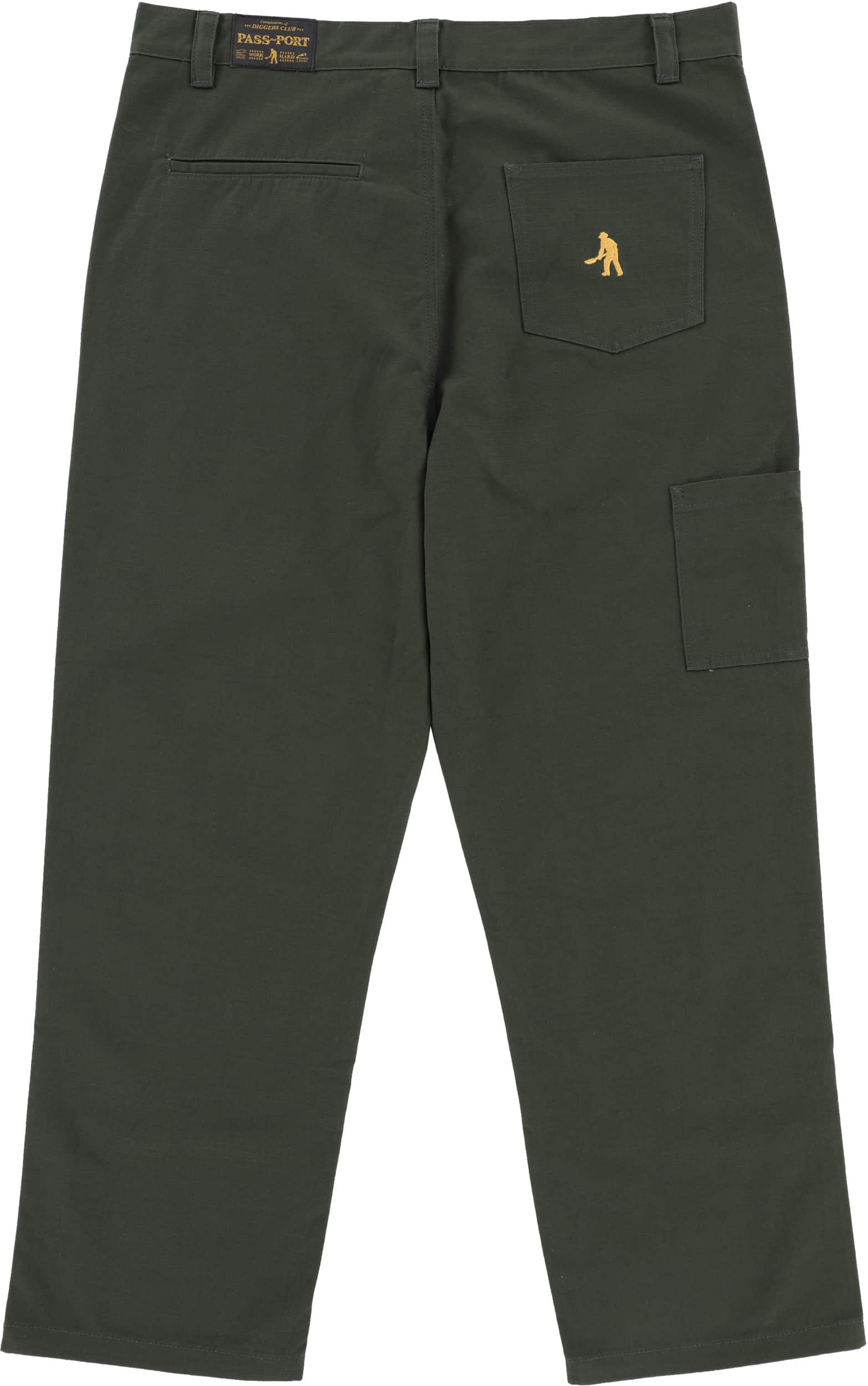 Pass~Port Ripstop Double Knee Diggers Club pant in dark green from range #45. The Double knee pant is made from 100% cotton ripstop and has been updated with double paneling in the knees with rivets. Made for hard work these trousers feature the digger embroidery on back pocket as well tonal triple stitch construction.