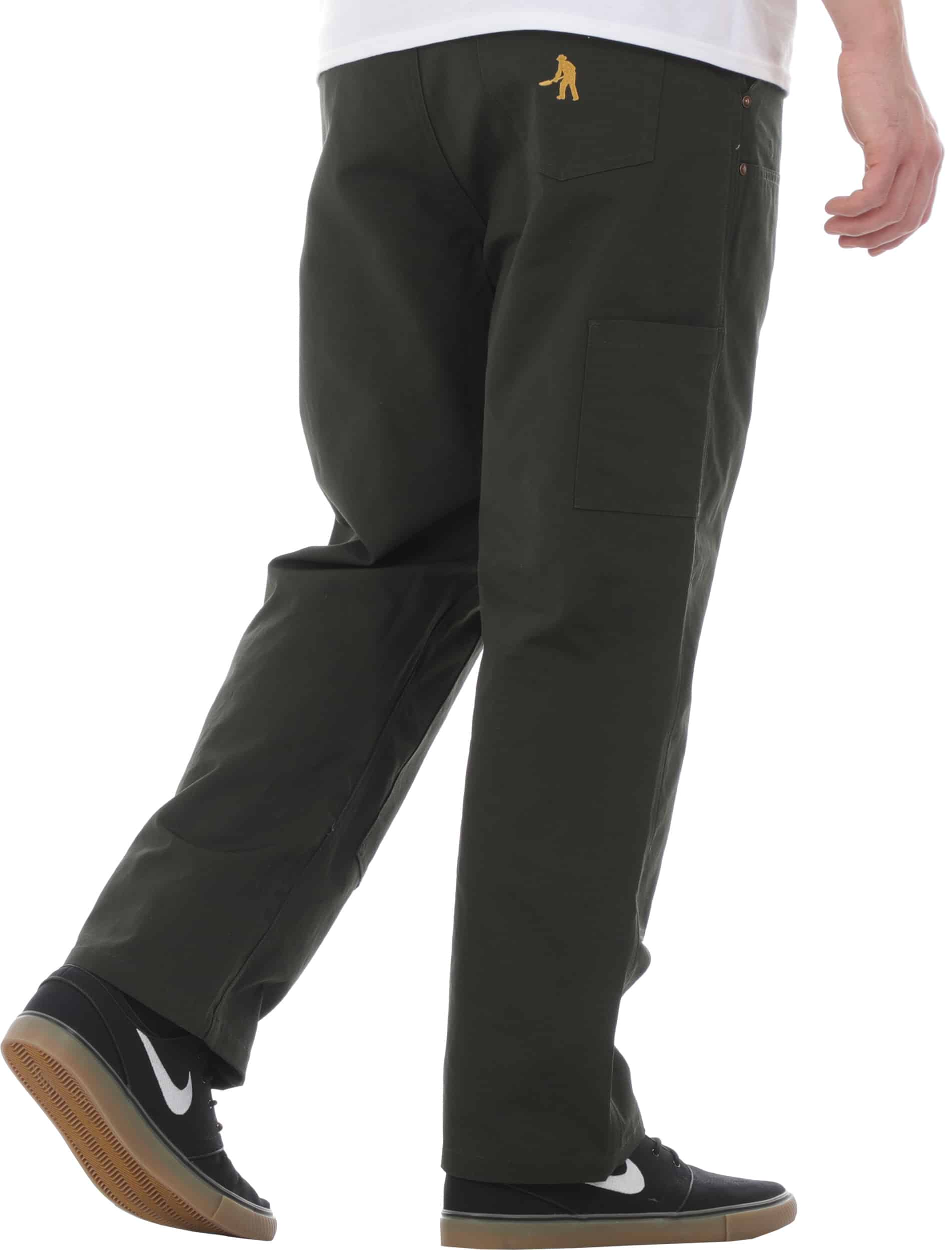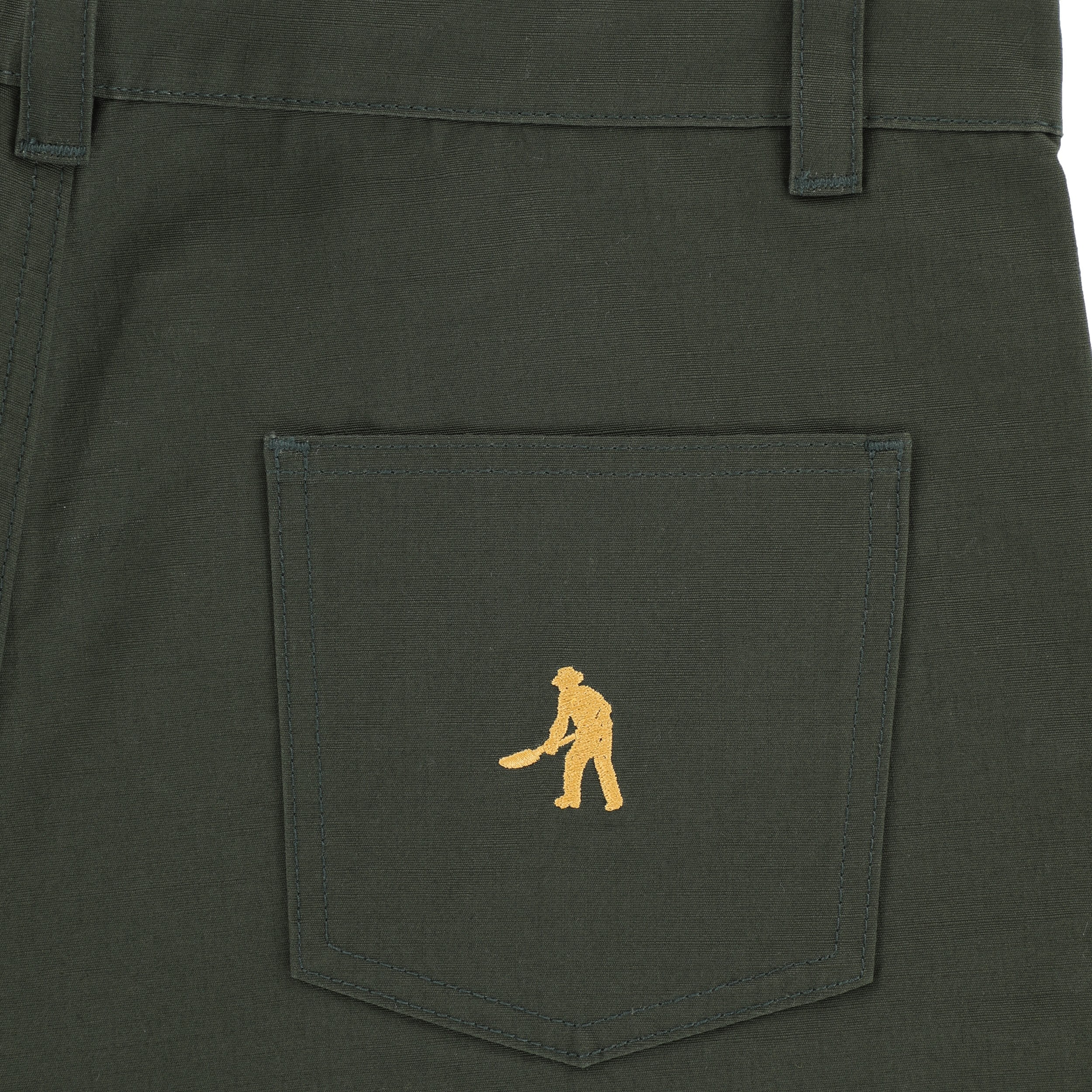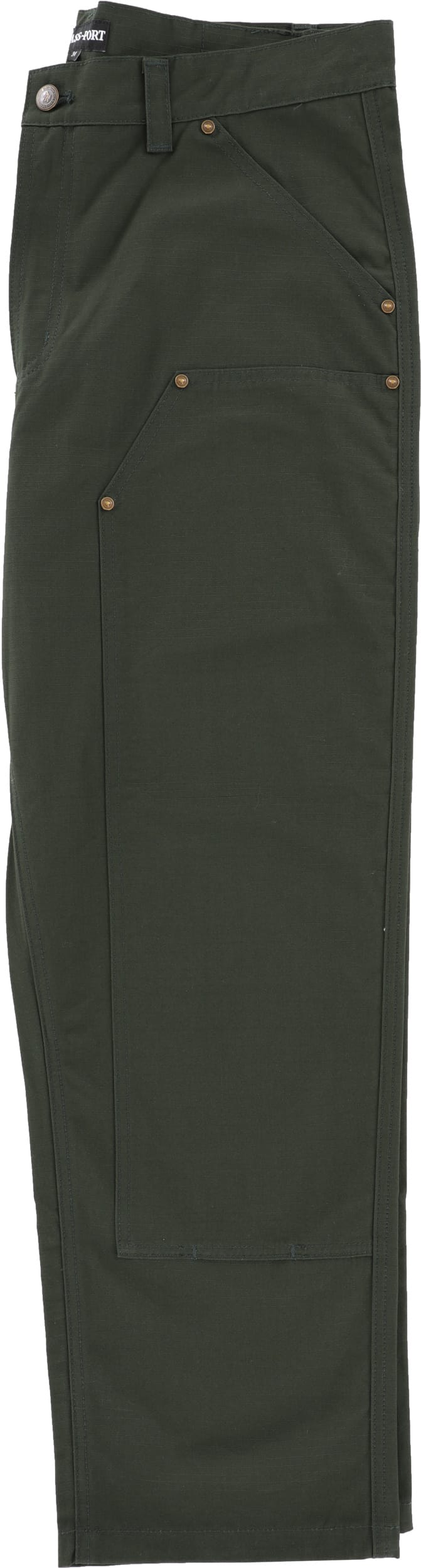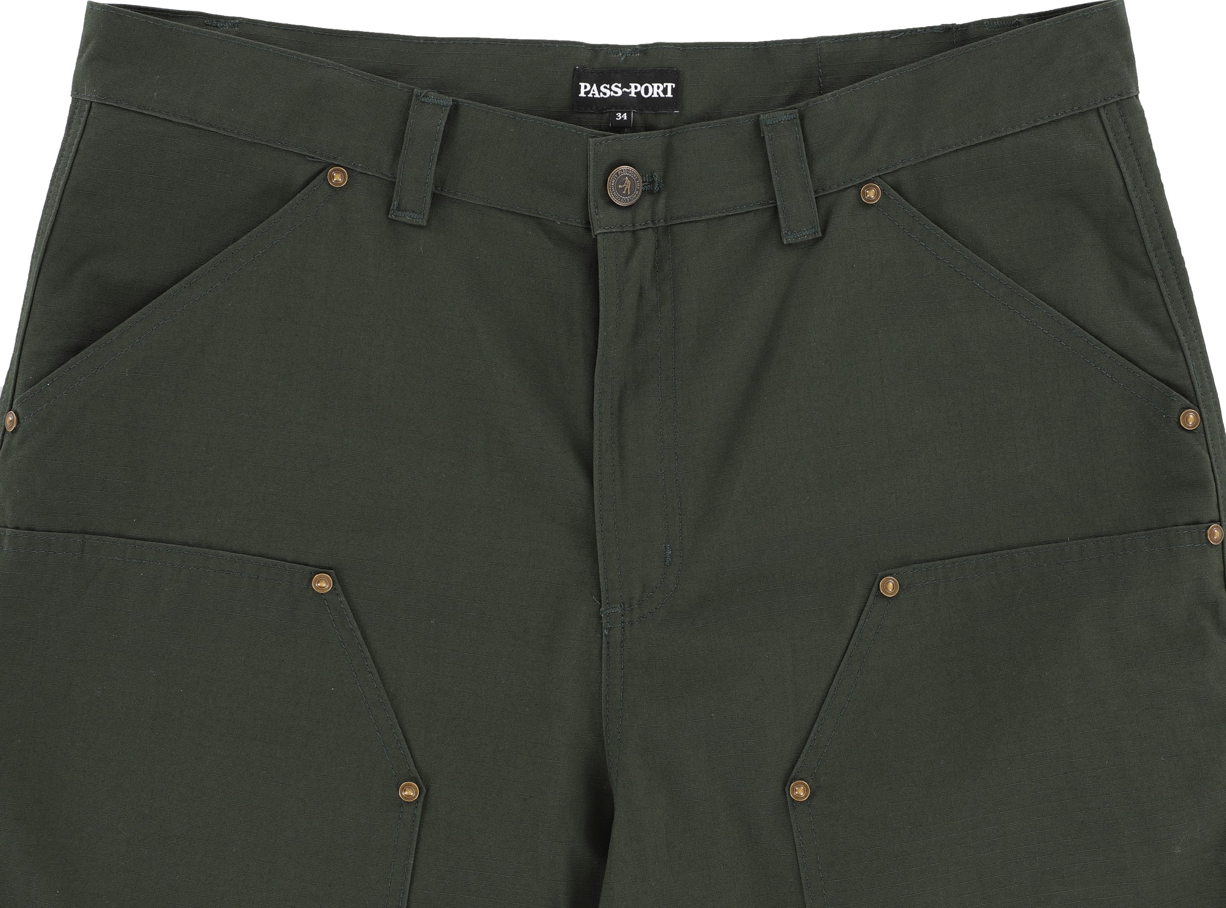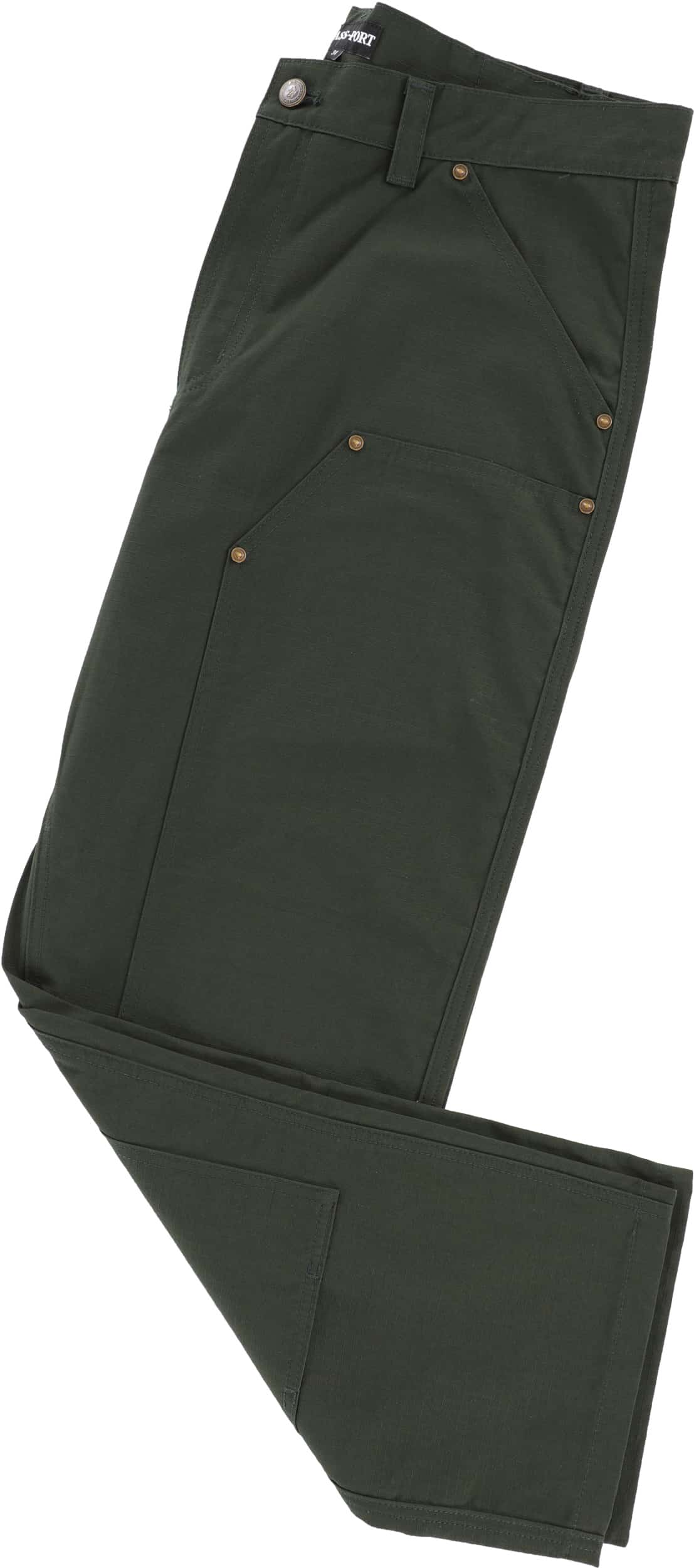 Pass~Port Ripstop Double Knee Diggers Club pant in dark green from range #45. The Double knee pant is made from 100% cotton ripstop and has been updated with double paneling in the knees with rivets. Made for hard work these trousers feature the digger embroidery on back pocket as well tonal triple stitch construction.