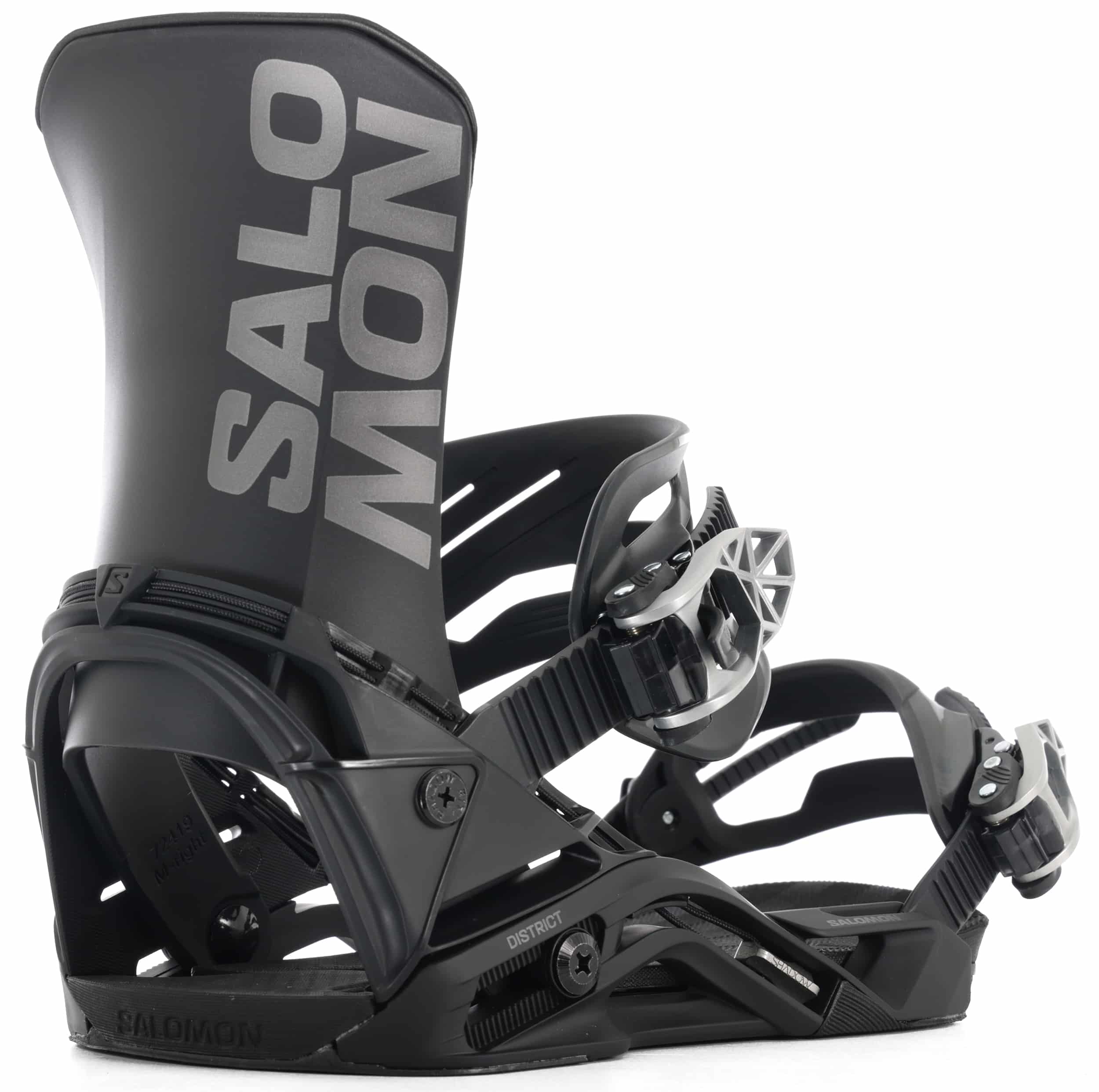 The Salomon District Snowboard Bindings offer a mid flex and an asymmetrical design, providing uncompromised forgiveness in the park and on groomers. Featuring Salomon's ShadowFit heelcup, these bindings create a natural connection between your binding and boots for enhanced performance and comfort. An asymmetrical highback and injected strap ensure a balanced blend of support and maneuverability.