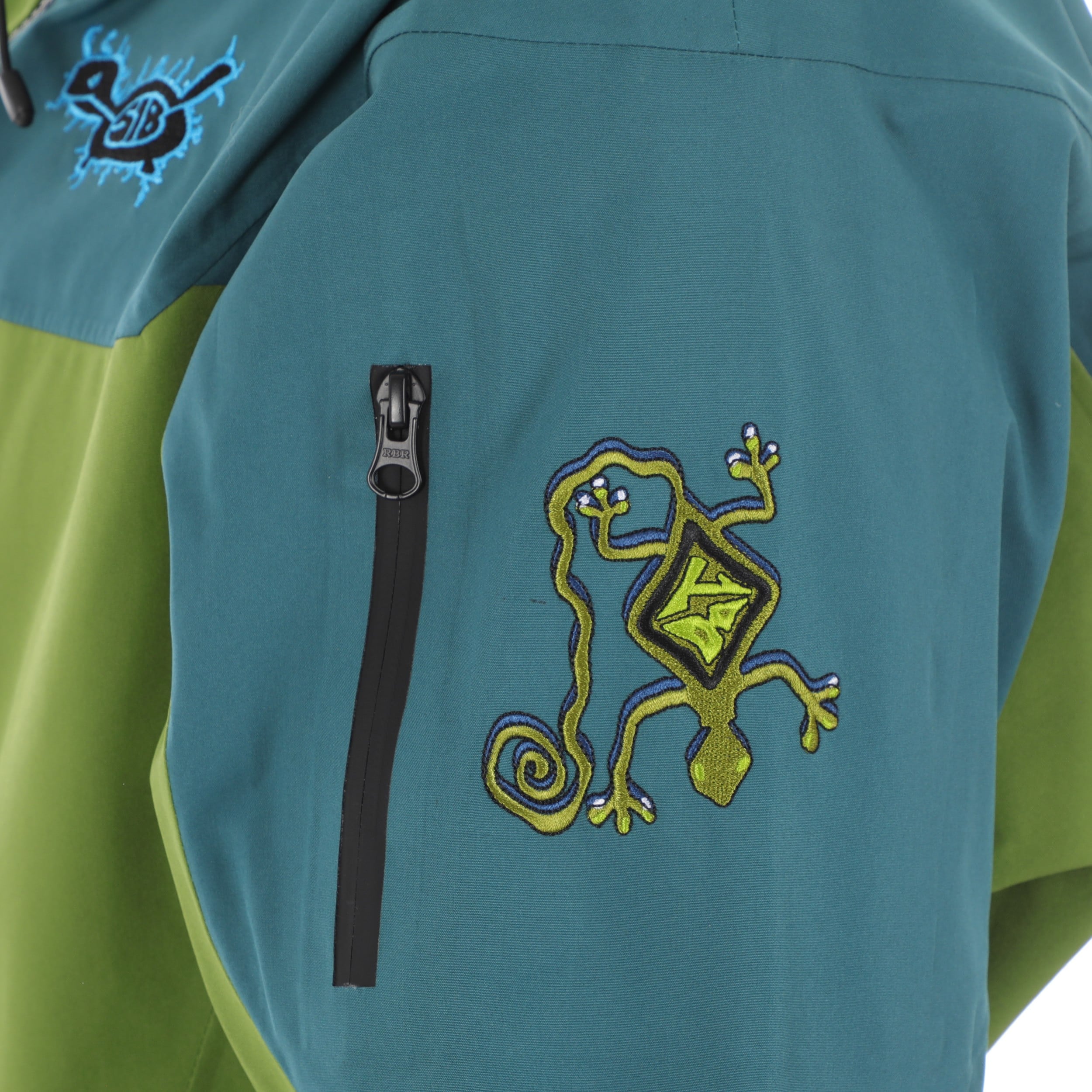2 chest pockets (waterproof zippers), 2 hidden waist pockets, and a sleeve pocket for your pass