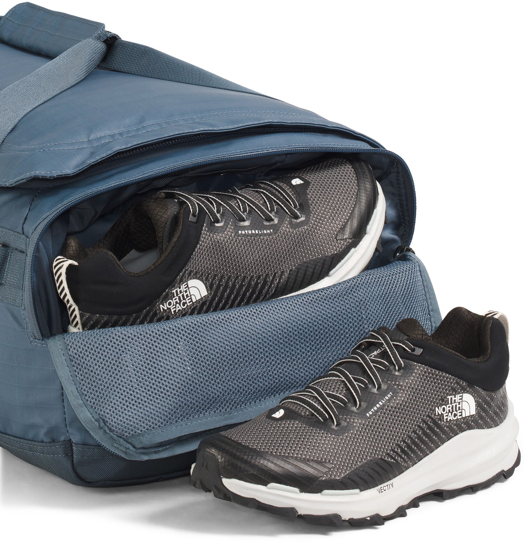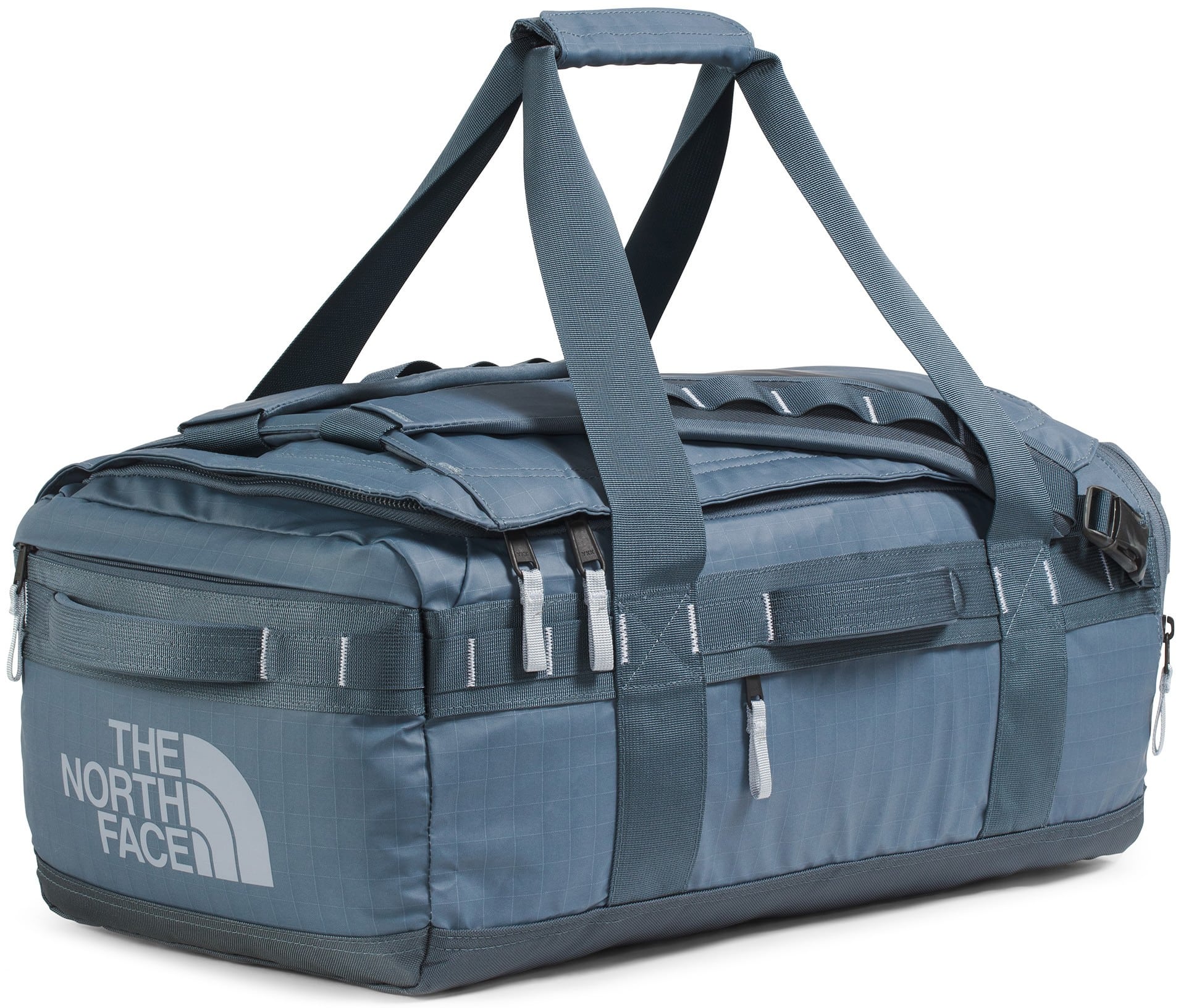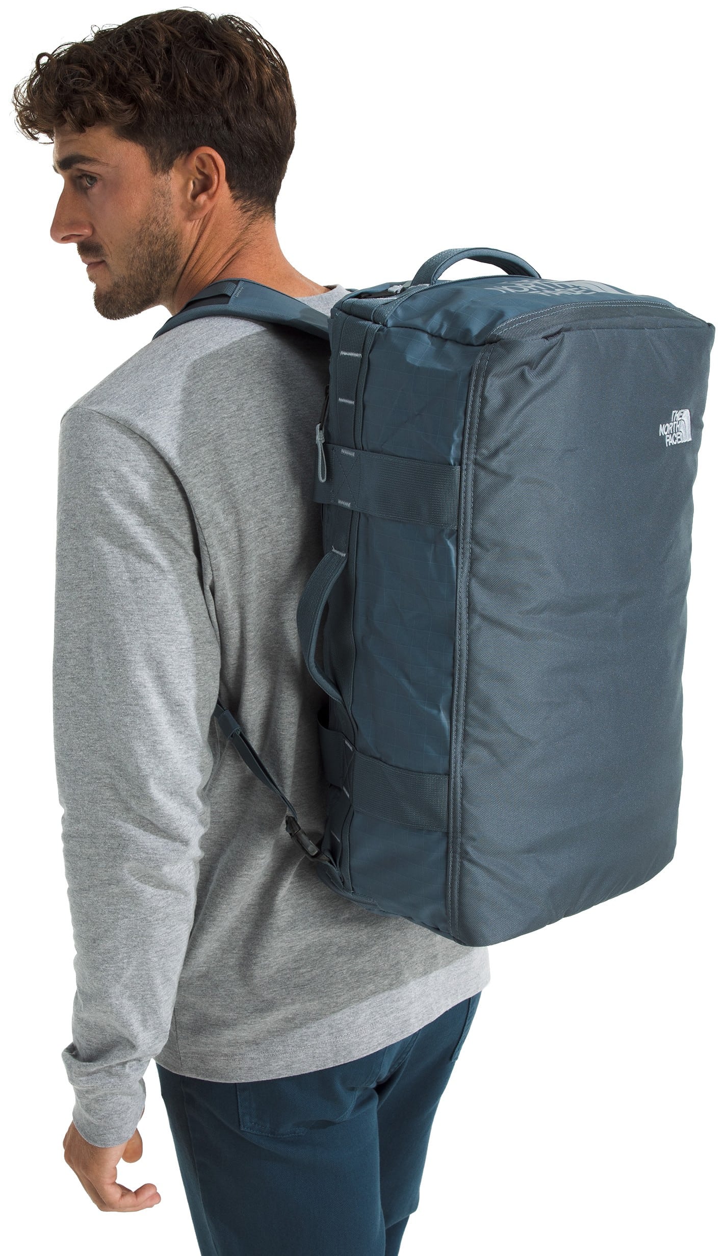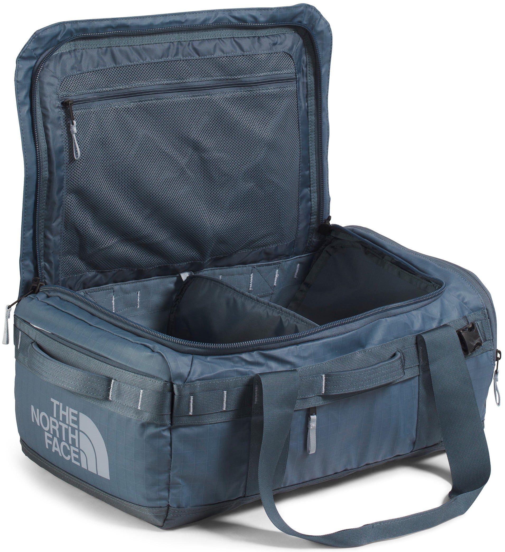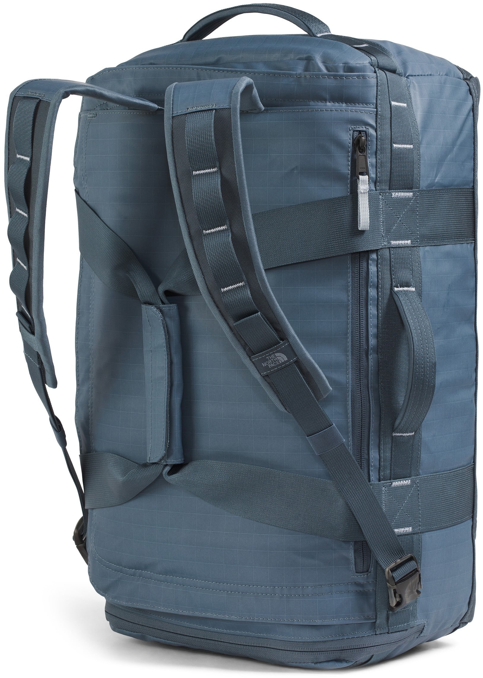 The North Face Base Camp Voyager 42L Duffel is a lightweight, carry-on-sized travel hauler featuring a removable and adjustable internal divider, allowing you to easily separate clean clothes from dirty gear or shoes during weekend trips. Its 300D recycled polyester tarpaulin construction is paired with padded, concealable shoulder straps, letting you switch from a duffel to a backpack for hands-free mobility through crowded airports. Designed for modern travel, it also includes a secure-zip padded laptop sleeve that fits devices up to 15", ensuring your tech stays protected while remaining accessible without opening the main compartment.