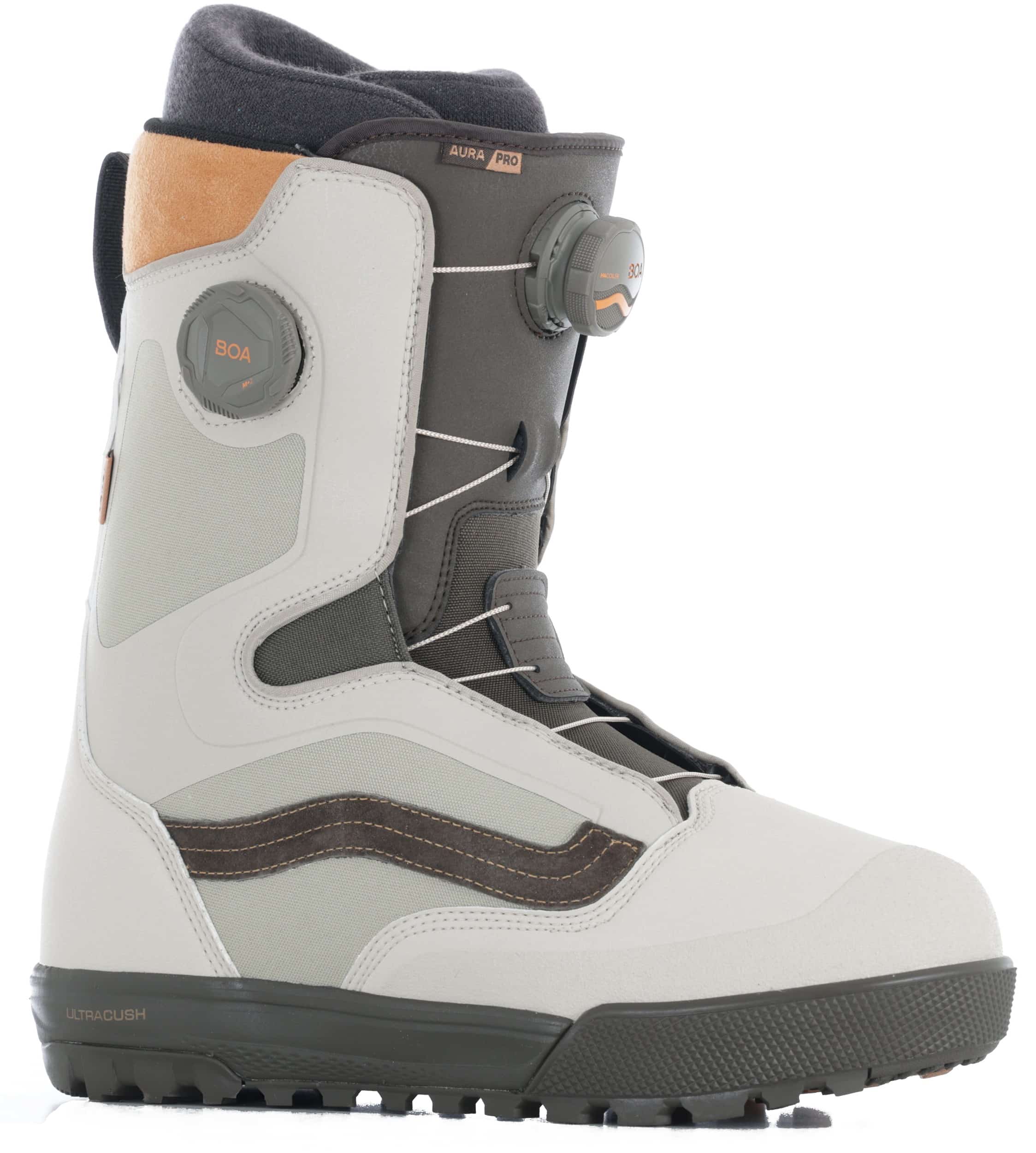 The Vans Aura Pro Snowboard Boots are built for all-mountain adventures and aggressive riding. A step up from the OG version, these boots feature a medium flex that's ideal for intermediate and advanced riders who crave a balance of support and control when pushing their limits. Vans focuses on comfort with the Aura Pro. The V2 liner and V2 POPCUSH footbed work together to deliver a supportive fit and impact-absorbing cushioning. This combination reduces fatigue and keeps your feet happy all day long, no matter how hard you charge. With its enhanced comfort, supportive flex, and user-friendly BOA closure system, the Vans Aura Pro Snowboard Boots are a great choice for all-mountain freeriders ready to take their snowboarding to the next level.