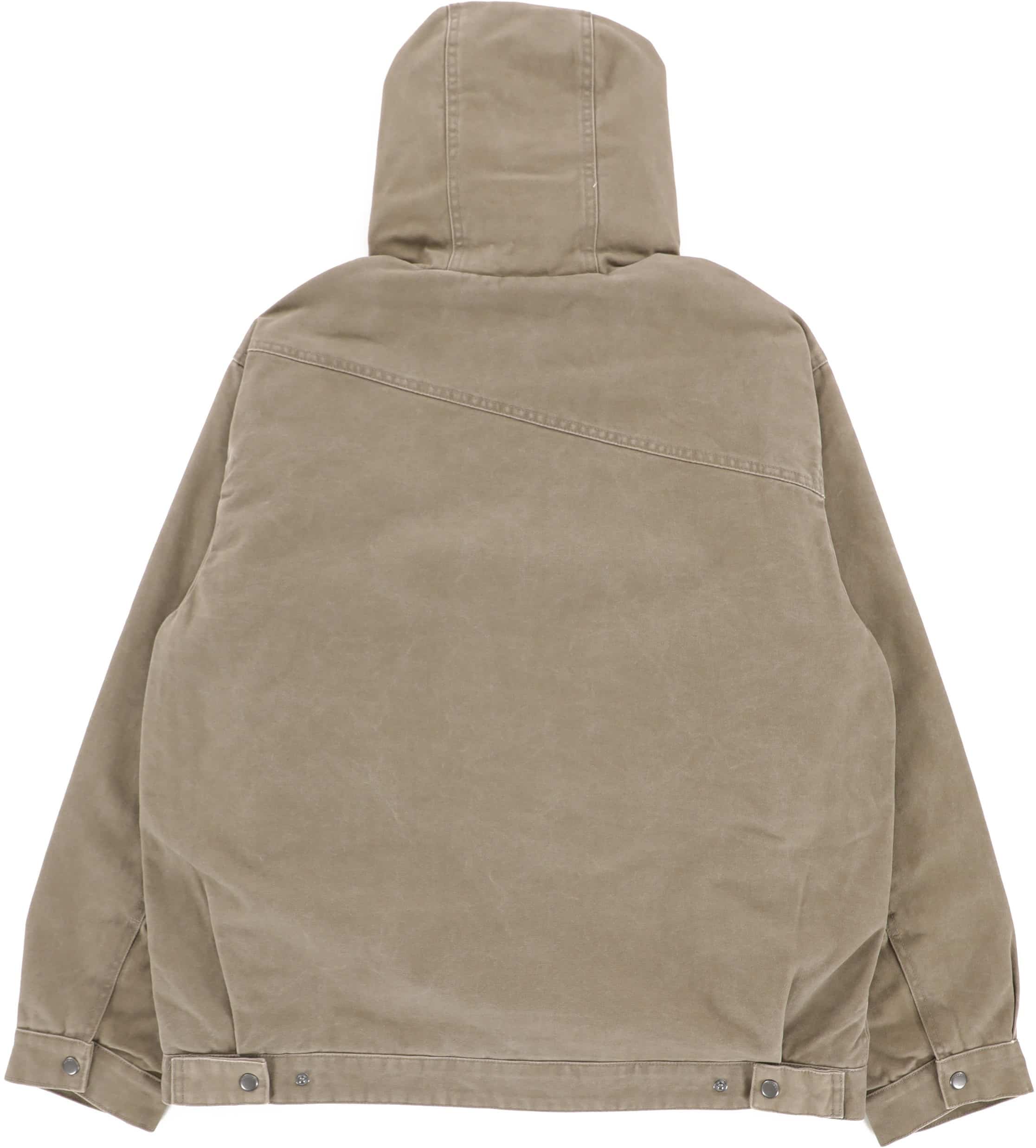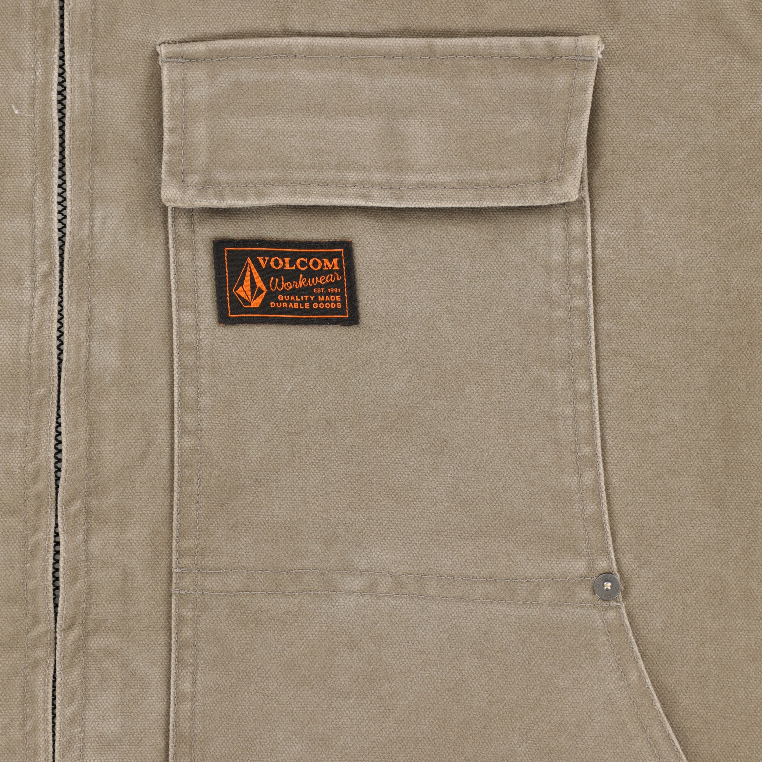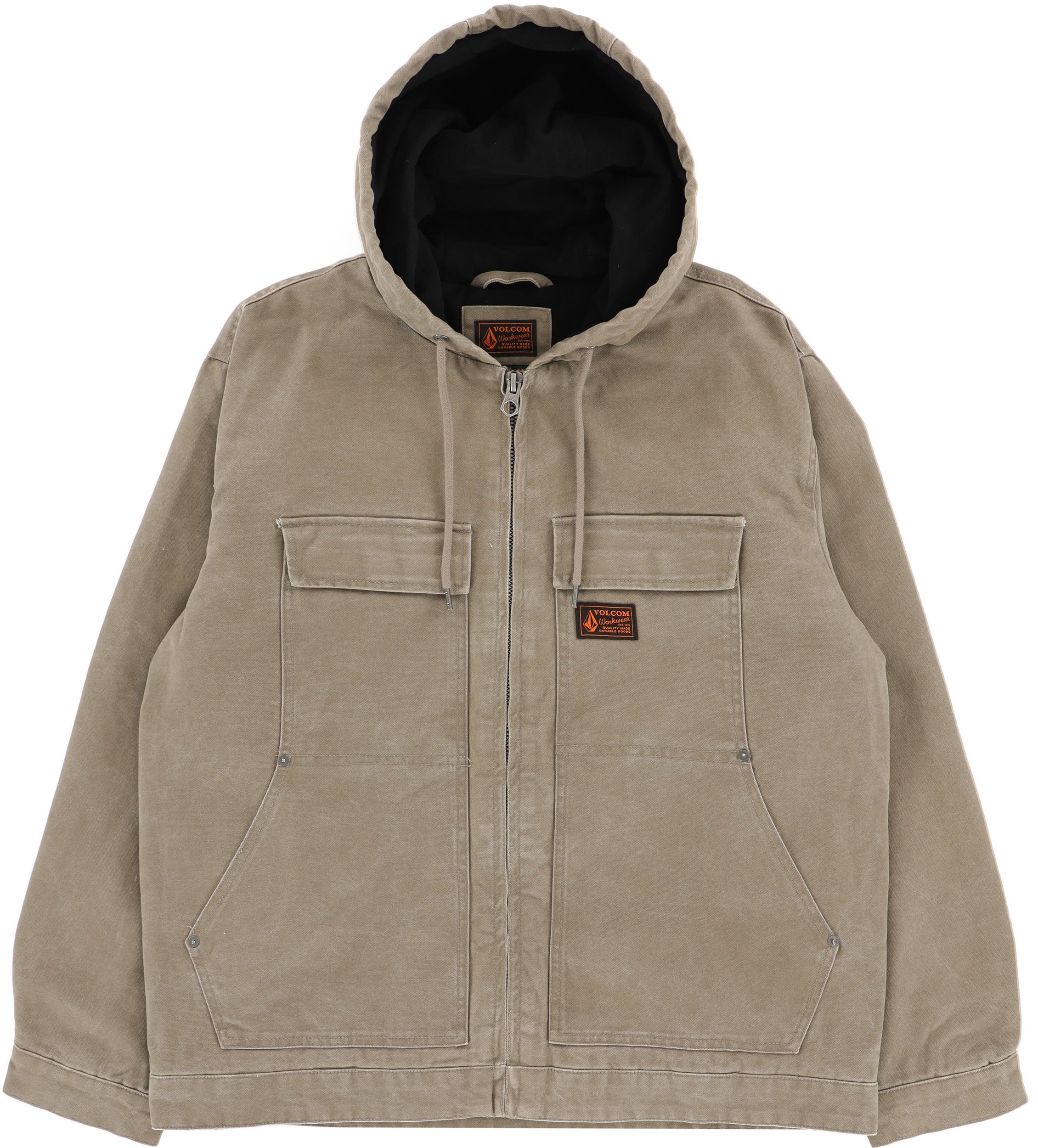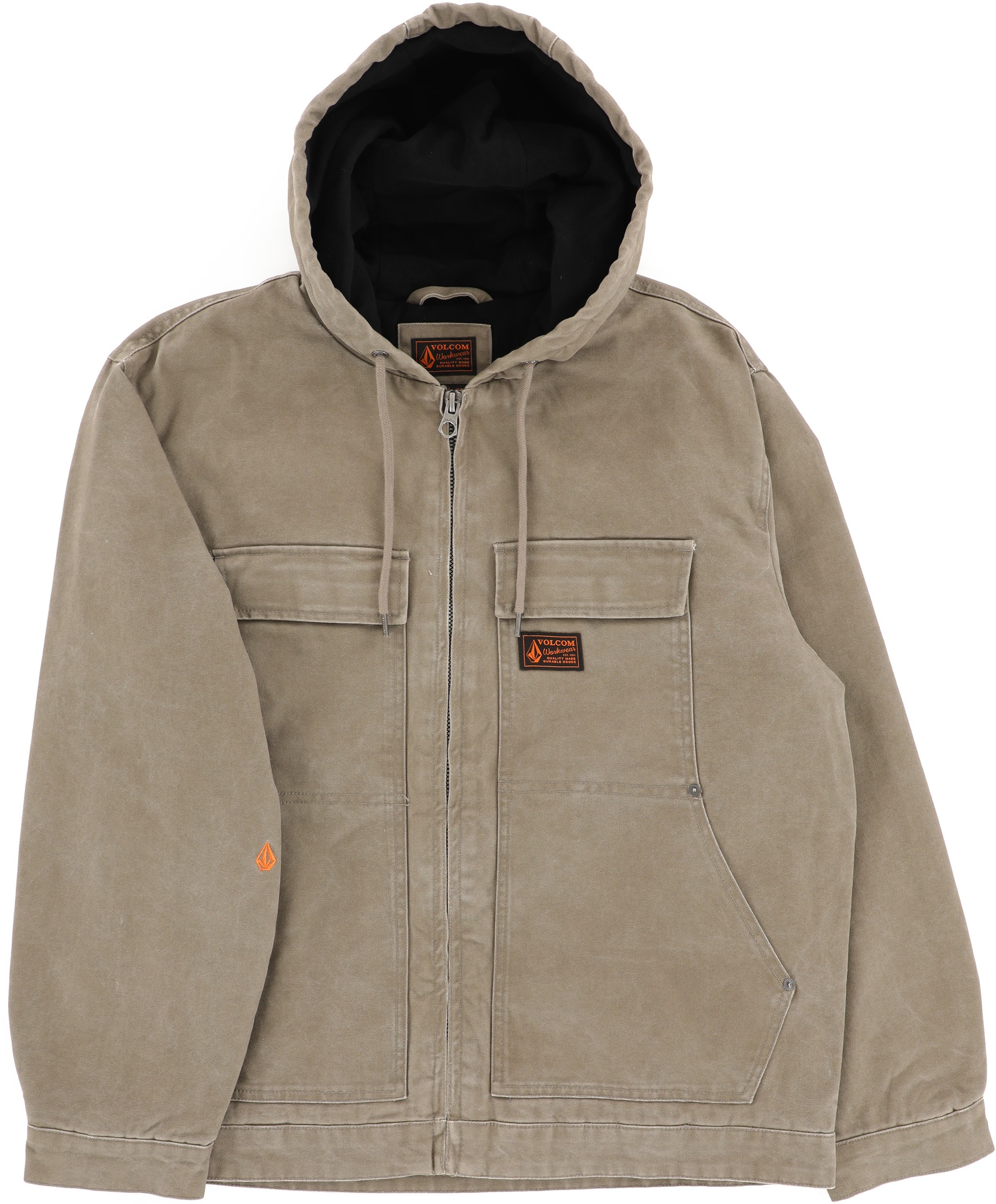 Be ready for chilly days in the VolcomĀ® Freshdust Workwear Jacket. This heavy weight hooded canvas jacket features a front zipper closure, drawstrings at hood for adjustability, long sleeves with button closure cuffs, chest flap closure pockets, and hand pockets.